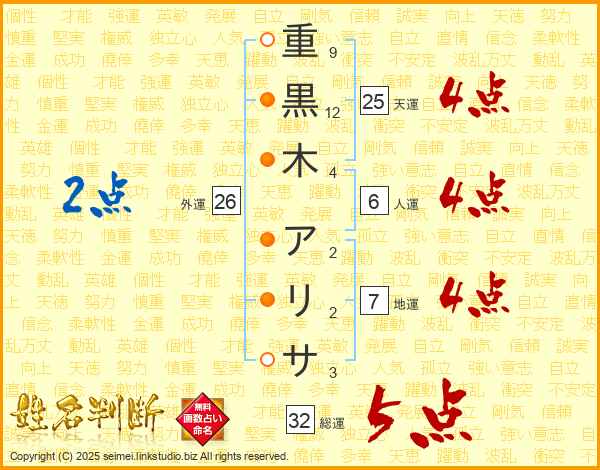 あなたの人生を表す1番重要な運勢です。生涯を通じて影響する総合運となり、主に50歳以降の晩年期に影響を及ぼします。苗字と名前の合計画数。