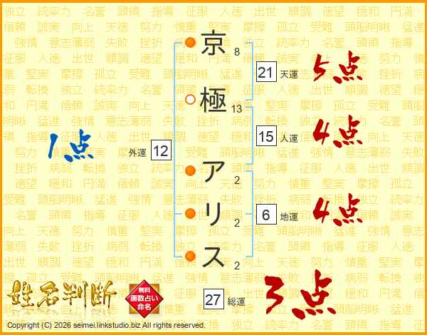 京(8画)極(13画) ア(2画)リ(2画)ス(2画)