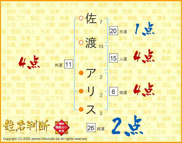佐(7画)渡(13画) ア(2画)リ(2画)ス(2画)