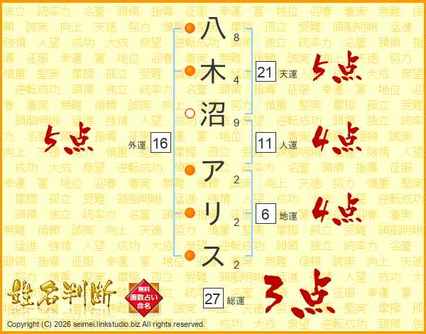 八木沼アリスさんの人運は11画の4点!