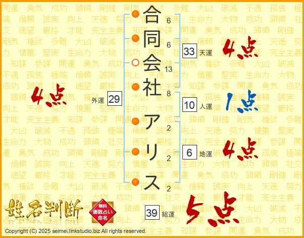生活面を象徴する運勢です。外部から受ける影響力を表し、結婚運、家庭運や職場、環境への順応性を表します。総運から人運を引いた画数。姓や名が1文字の場合を除く。