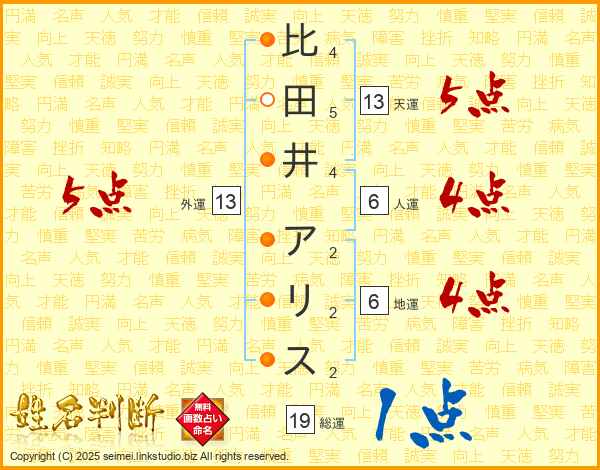 比(4画)田(5画)井(4画) ア(2画)リ(2画)ス(2画)