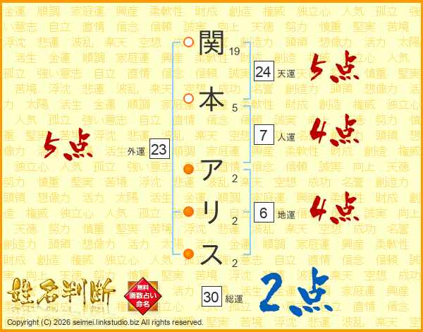 生活面を象徴する運勢です。外部から受ける影響力を表し、結婚運、家庭運や職場、環境への順応性を表します。総運から人運を引いた画数。姓や名が1文字の場合を除く。