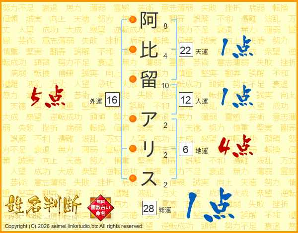 阿比留アリスさんの総運は28画の1点!