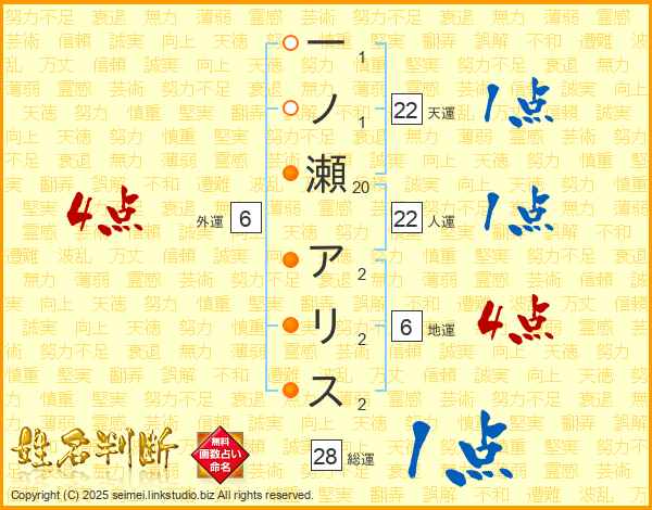 生活面を象徴する運勢です。外部から受ける影響力を表し、結婚運、家庭運や職場、環境への順応性を表します。総運から人運を引いた画数。姓や名が1文字の場合を除く。