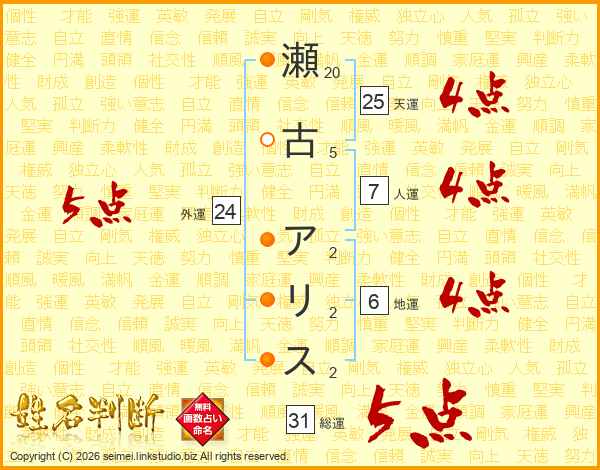 瀬(20画)古(5画) ア(2画)リ(2画)ス(2画)