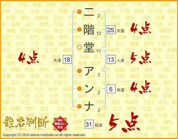 生活面を象徴する運勢です。外部から受ける影響力を表し、結婚運、家庭運や職場、環境への順応性を表します。総運から人運を引いた画数。姓や名が1文字の場合を除く。