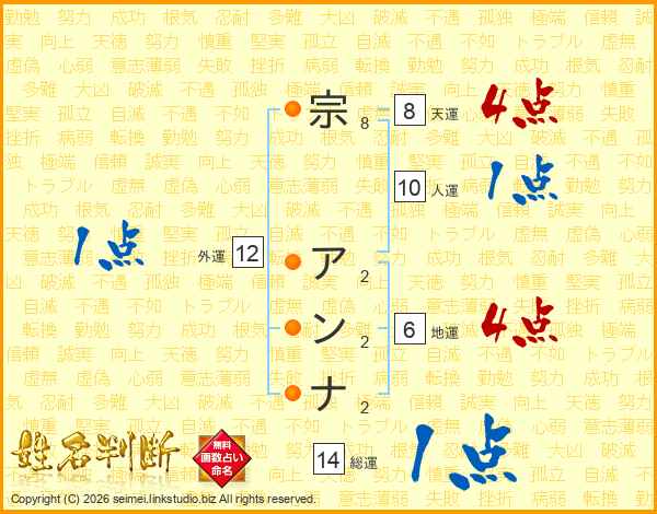 宗アンナさんの総運は14画の1点!