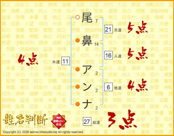 尾(7画)鼻(14画) ア(2画)ン(2画)ナ(2画)