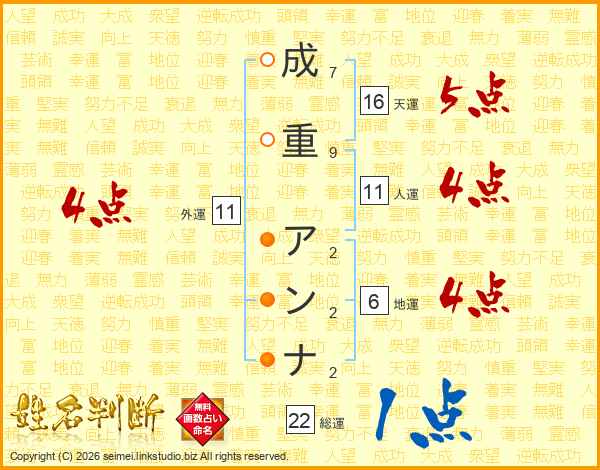 成(7画)重(9画) ア(2画)ン(2画)ナ(2画)