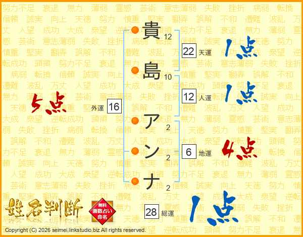 貴(12画)島(10画) ア(2画)ン(2画)ナ(2画)