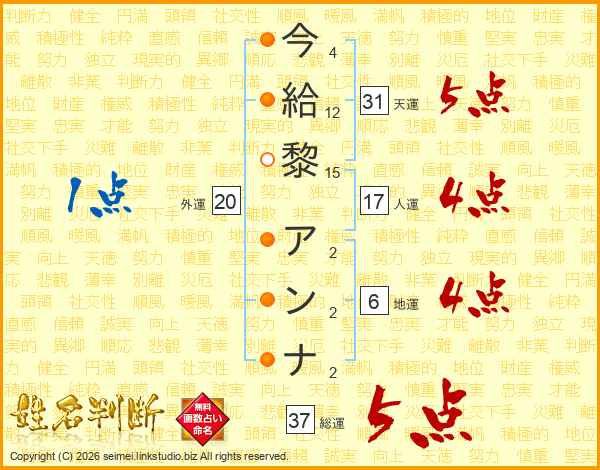 今(4画)給(12画)黎(15画) ア(2画)ン(2画)ナ(2画)
