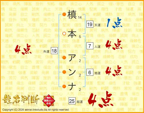 槙(14画)本(5画) ア(2画)ン(2画)ナ(2画)