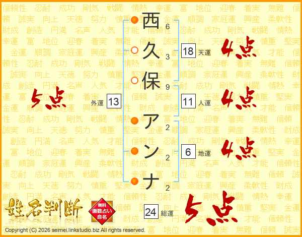 西(6画)久(3画)保(9画) ア(2画)ン(2画)ナ(2画)