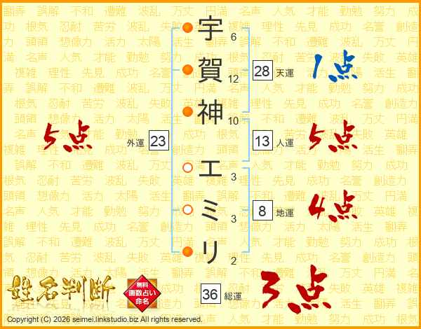 宇(6画)賀(12画)神(10画) エ(3画)ミ(3画)リ(2画)