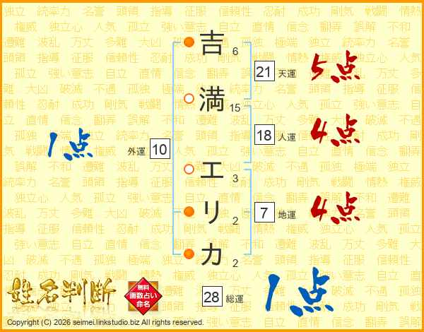 吉(6画)満(15画) エ(3画)リ(2画)カ(2画)