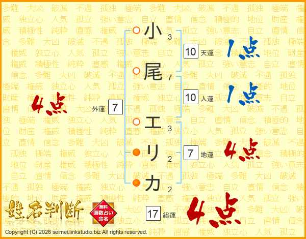 小尾エリカさんの総運は17画の4点!