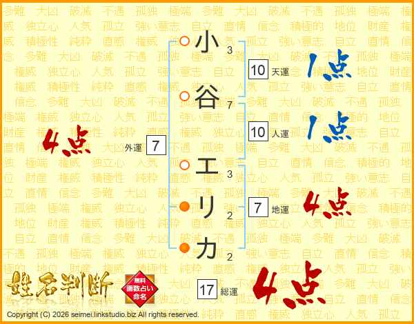 小谷エリカさんの総運は17画の4点!