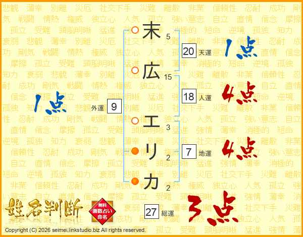 生活面を象徴する運勢です。外部から受ける影響力を表し、結婚運、家庭運や職場、環境への順応性を表します。総運から人運を引いた画数。姓や名が1文字の場合を除く。
