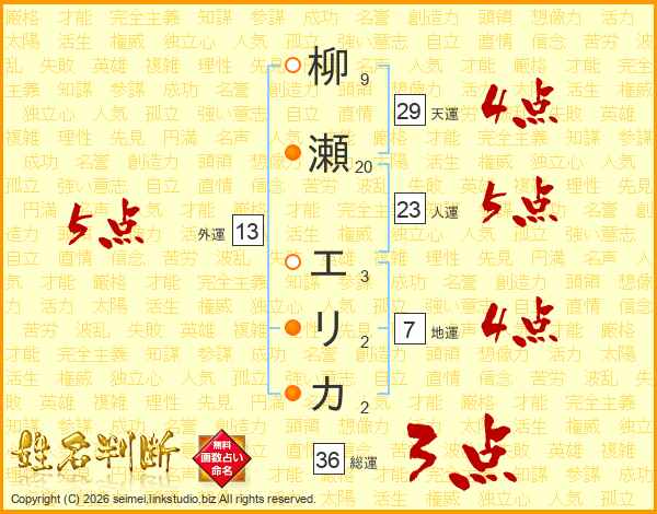 柳瀬エリカさんの総運は36画の3点!