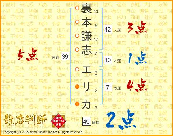 裏(13画)本(5画)謙(17画)志(7画) エ(3画)リ(2画)カ(2画)
