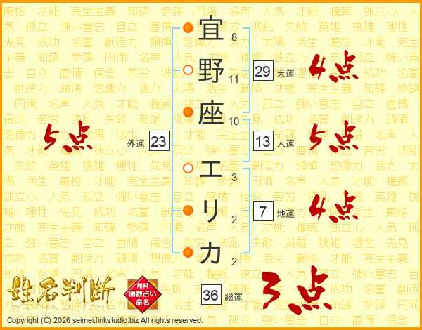生活面を象徴する運勢です。外部から受ける影響力を表し、結婚運、家庭運や職場、環境への順応性を表します。総運から人運を引いた画数。姓や名が1文字の場合を除く。