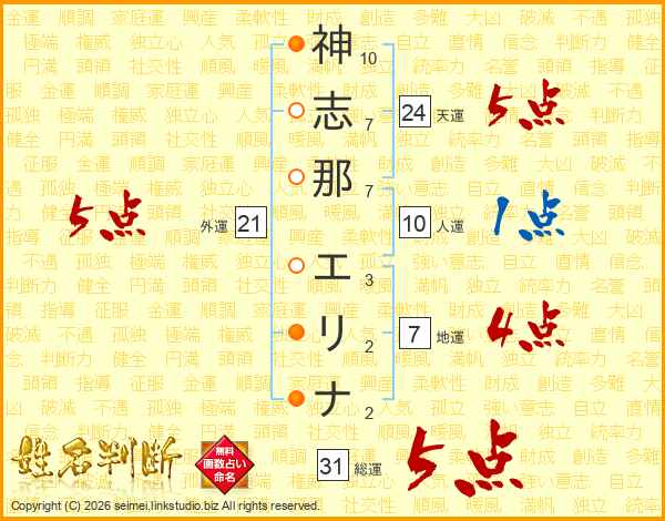 神(10画)志(7画)那(7画) エ(3画)リ(2画)ナ(2画)