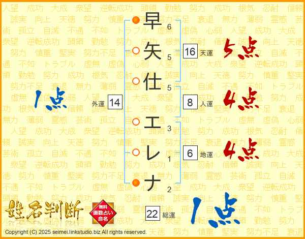 生活面を象徴する運勢です。外部から受ける影響力を表し、結婚運、家庭運や職場、環境への順応性を表します。総運から人運を引いた画数。姓や名が1文字の場合を除く。