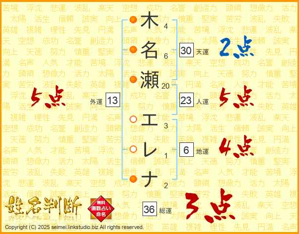 生活面を象徴する運勢です。外部から受ける影響力を表し、結婚運、家庭運や職場、環境への順応性を表します。総運から人運を引いた画数。姓や名が1文字の場合を除く。