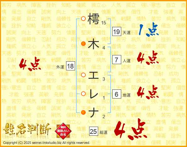 あなたの人生を表す1番重要な運勢です。生涯を通じて影響する総合運となり、主に50歳以降の晩年期に影響を及ぼします。苗字と名前の合計画数。