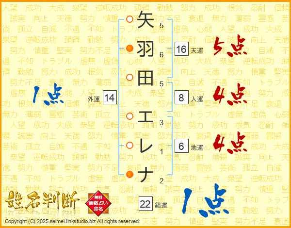 矢羽田エレナさんの天運は16画の5点!