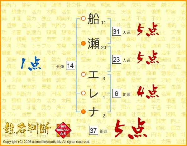 生活面を象徴する運勢です。外部から受ける影響力を表し、結婚運、家庭運や職場、環境への順応性を表します。総運から人運を引いた画数。姓や名が1文字の場合を除く。