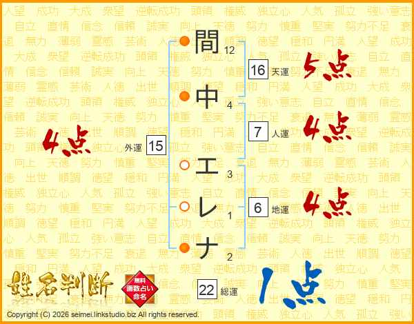 間中エレナさんの総運は22画の1点!
