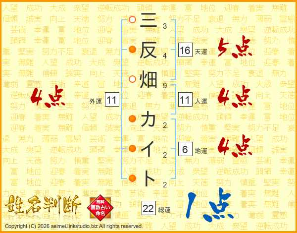 あなたの人生を表す1番重要な運勢です。生涯を通じて影響する総合運となり、主に50歳以降の晩年期に影響を及ぼします。苗字と名前の合計画数。