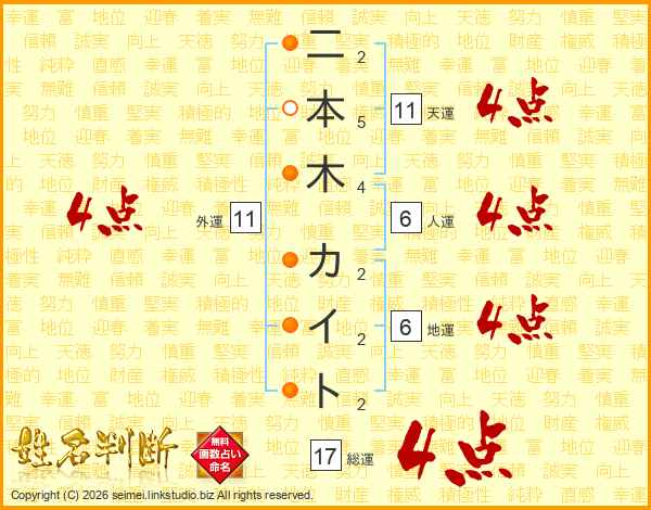 二本木カイトさんの総運は17画の4点!