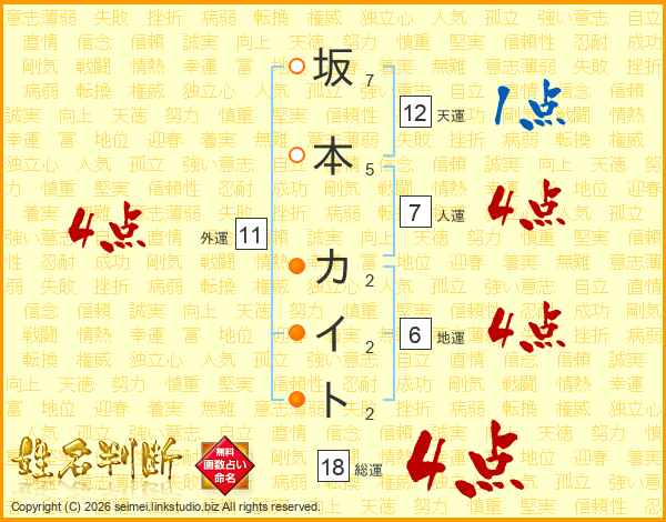 坂本カイトさんの総運は18画の4点!