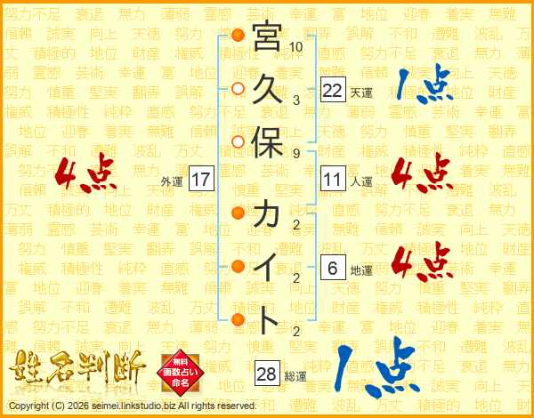 宮久保カイトさんの総運は28画の1点!