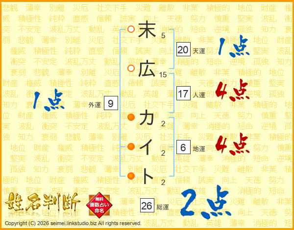 生活面を象徴する運勢です。外部から受ける影響力を表し、結婚運、家庭運や職場、環境への順応性を表します。総運から人運を引いた画数。姓や名が1文字の場合を除く。