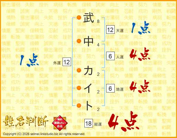 武(8画)中(4画) カ(2画)イ(2画)ト(2画)