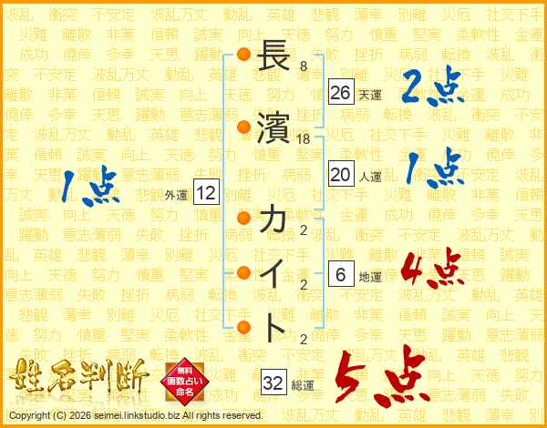 あなたの人生を表す1番重要な運勢です。生涯を通じて影響する総合運となり、主に50歳以降の晩年期に影響を及ぼします。苗字と名前の合計画数。