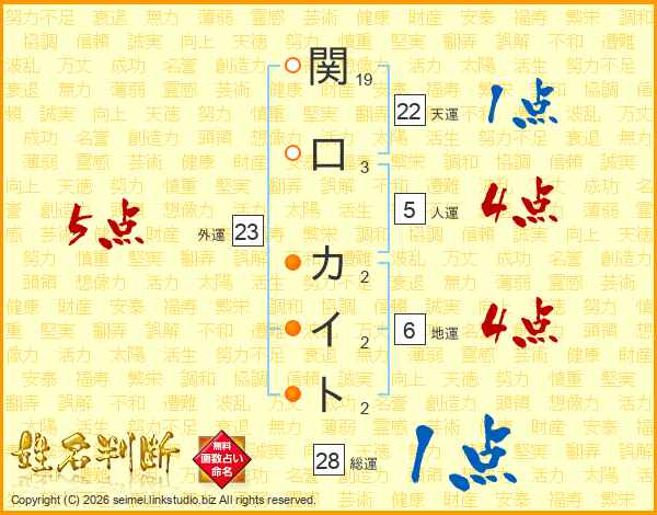 関口カイトさんの総運は28画の1点!