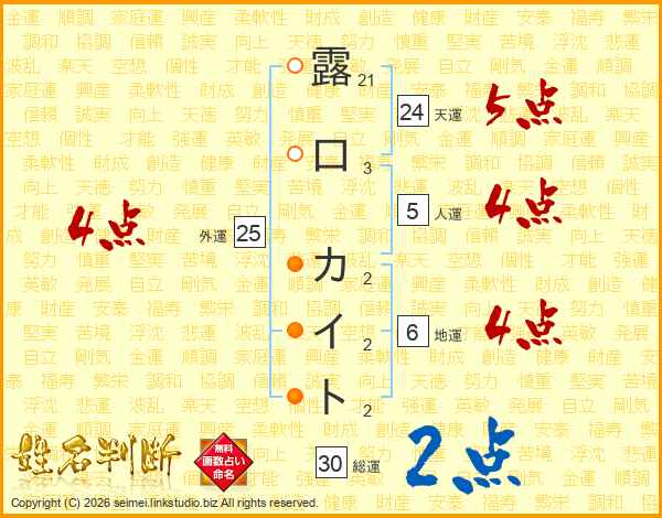 生活面を象徴する運勢です。外部から受ける影響力を表し、結婚運、家庭運や職場、環境への順応性を表します。総運から人運を引いた画数。姓や名が1文字の場合を除く。