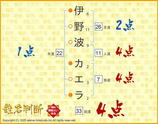 伊(6画)野(11画)波(9画) カ(2画)エ(3画)ラ(2画)