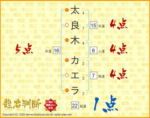 太良木カエラさんの地運は7画の4点!