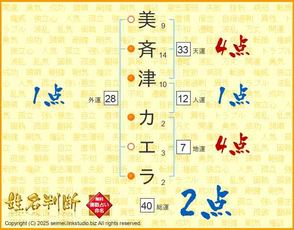 美(9画)斉(14画)津(10画) カ(2画)エ(3画)ラ(2画)