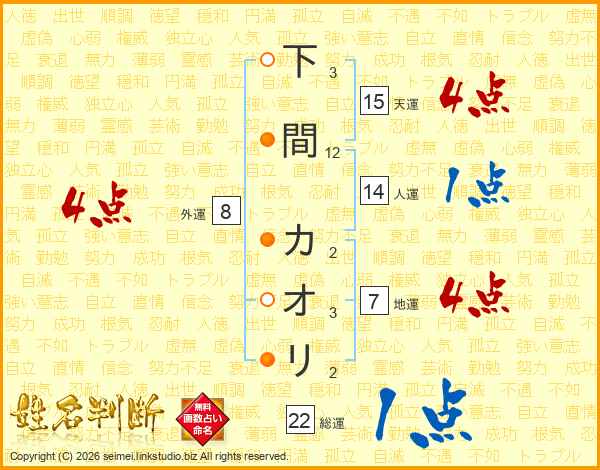 生活面を象徴する運勢です。外部から受ける影響力を表し、結婚運、家庭運や職場、環境への順応性を表します。総運から人運を引いた画数。姓や名が1文字の場合を除く。