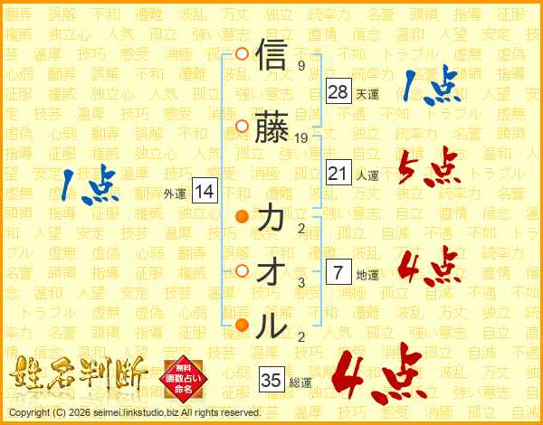 信(9画)藤(19画) カ(2画)オ(3画)ル(2画)