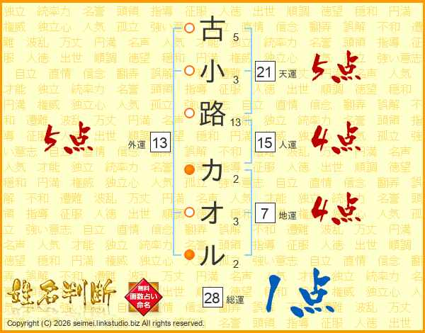 古(5画)小(3画)路(13画) カ(2画)オ(3画)ル(2画)