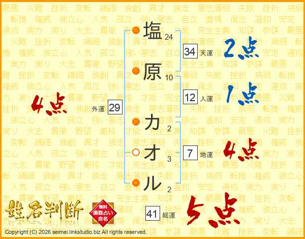 塩(24画)原(10画) カ(2画)オ(3画)ル(2画)
