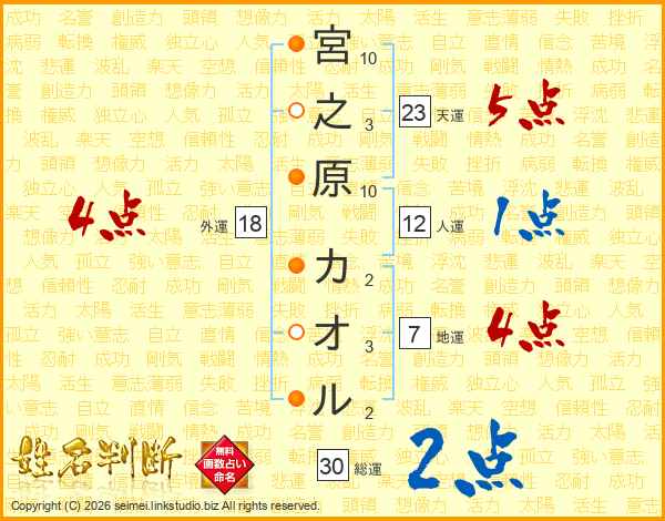 宮(10画)之(3画)原(10画) カ(2画)オ(3画)ル(2画)